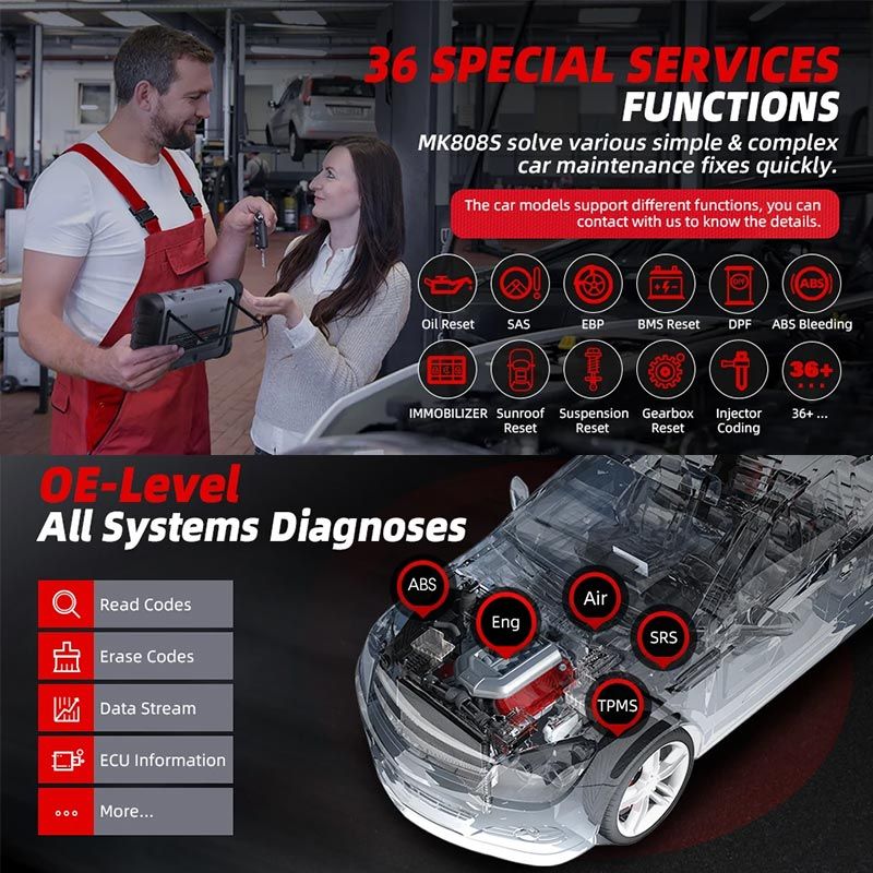 AVANCERADE DIAGNOSTIKFUNKTIONER: Felsökaren har avancerade diagnostikfunktioner som gör att du kan skanna, läsa och ta bort felkoder från olika fordonssystem, inklusive motor, transmission, ABS, SRS, bromssystem, utsläppssystem, bränslesystem, belysningssystem, torkarsystem med mera.