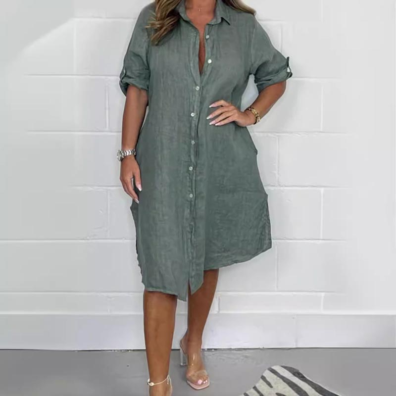 Den här skjortklänningen är gjord av högkvalitativ bomull och linne och är lätt, andas och mjuk mot huden, vilket säkerställer maximal komfort hela dagen.