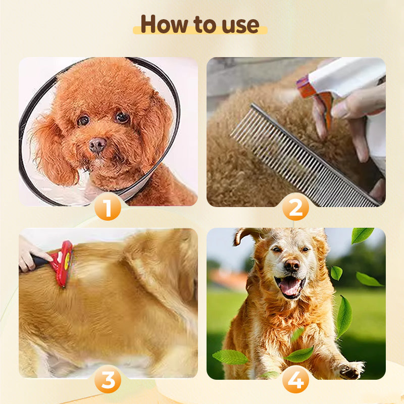 SNABB, ENKEL OCH SKITFRI ANVĂNDNING: Spraya helt enkelt direkt pĂ„ ditt husdjurs pĂ€ls - ingen sköljning, inga komplicerade steg. Den lĂ€tta formulan torkar snabbt och jĂ€mnt, vilket Ă€r bekvĂ€mt för upptagna djurĂ€gare.