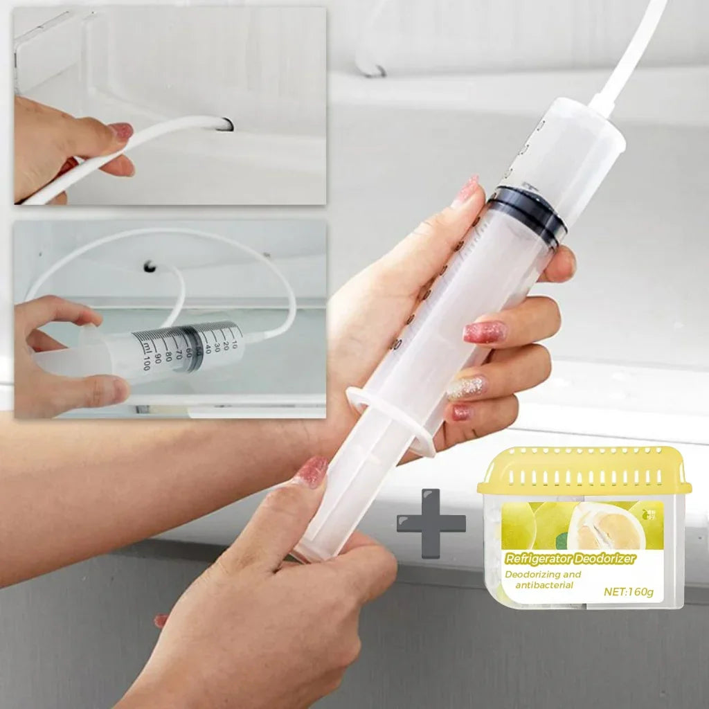 🔹 1 set * Rengöringsverktyg för kylskåpsrör (inkluderar avloppsborste, rör, spruta, isskrapa, vaskrensare)