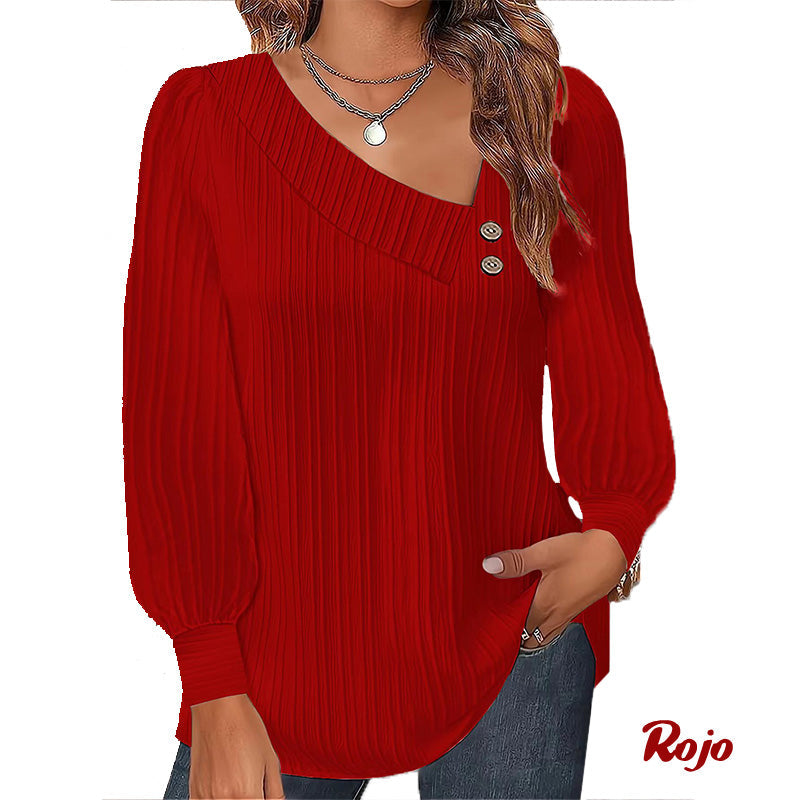 Typ: Långärmad damtopp med sned halsringning och veck i enfärgad modell